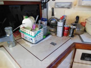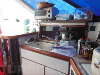 右舷側にはLS操船席、左舷側にはギャレーがあります。ギャレーにはシンクや冷蔵庫、電子レンジなどの装備があります。