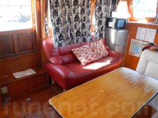左舷側には赤いソファーがあり、大勢でテーブルを囲むことが出来ます。その横には、電子レンジ、冷蔵庫などが装備されています。