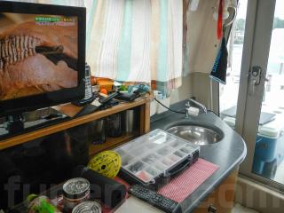 前方バースはカーテンで仕切られており、ちょっとしたプライベート感もあります。写真にある釣具は売却時には降ろしますので付属していません。