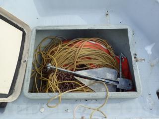 〇デッキ前方には、椅子が後付で設置されて、また収納入れとしても使えるようになっていますので、ロープや法廷備品や釣りの道具などの収納が可能となっています。