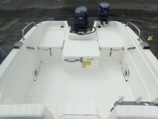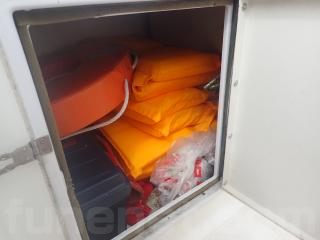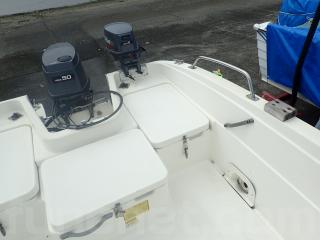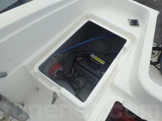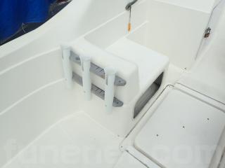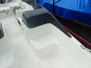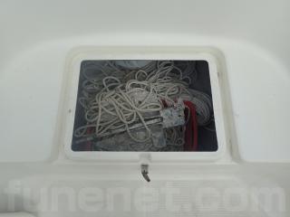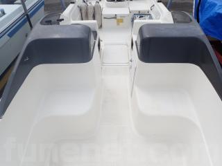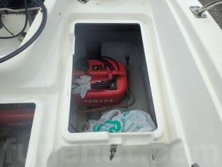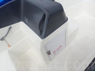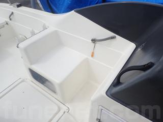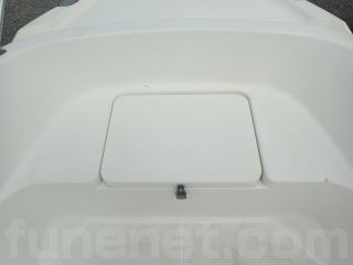 〇アフト側のハッチは座席シートとしくつろげます。また右舷側のハッチ内はバッテリー&バッテリースイッチ。 中央と左舷側の甲地内は燃料タンク収納。(24Lタンク2個)