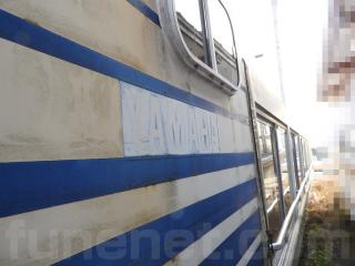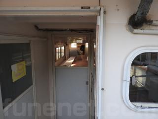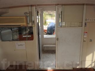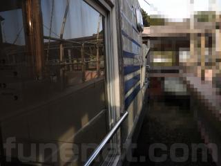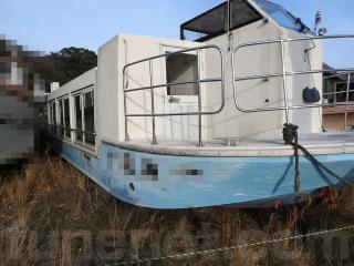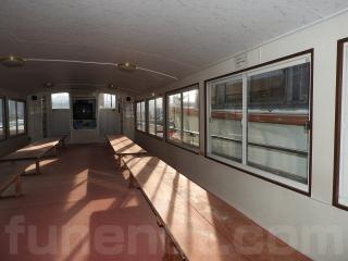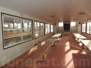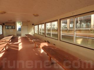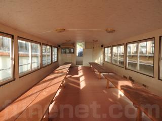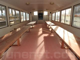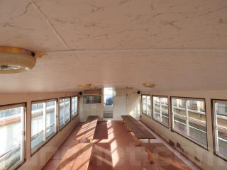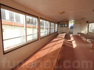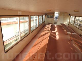 ◆船体はヤマハ、型式GJT 全長で約14,8m 幅3.3m、室内は広いです、部屋全体はそれなりに綺麗です、床は固く良好です、航行区域は平水〈河川に限る〉定員62名です、船舶検査は失効していますので受ける事が必要です、その際復元性試験も必要になります。
