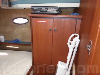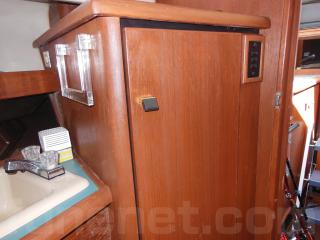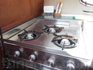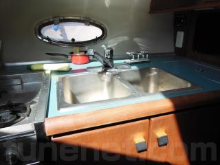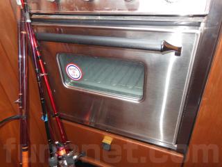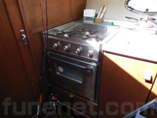 そのまま前方に進み階段を降りますと、右舷側にはギャレーがあります。ギャレーにはシンク、電子レンジ、オーブン、コンロ、冷蔵庫等の装備がされています。