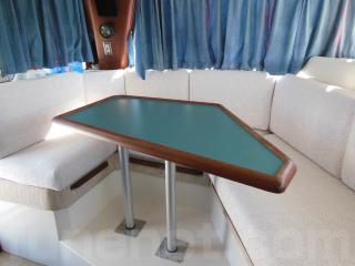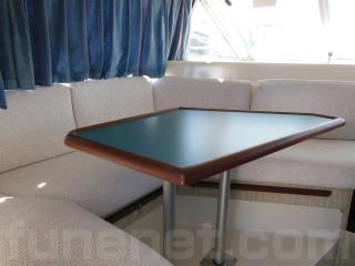 キャビン入口を入るとまず左舷側に大きなソファーとテーブルがあり、とても広い空間が確保されています。