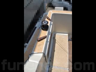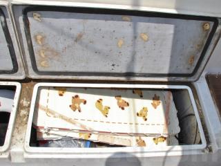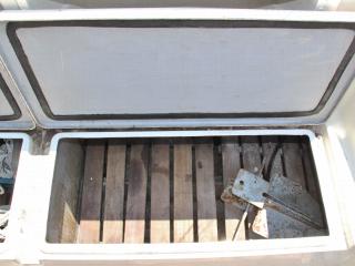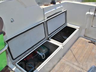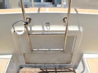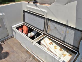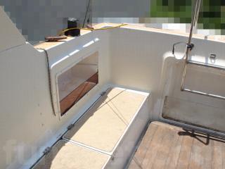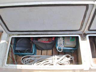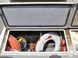 ◆アフトデッキはテーブルを置けば4名程度でちょっとしたパーティができる程度のスペースがあります。床ハッチ、ウッドの床材も硬く、特に大きな問題は無いように見受けられました。デッキ後方両舷に計4個のストレージがあり、色々な物が入れられそうです。ハッチも硬く、特に大きな問題は無いように見受けられました。