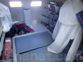 ・操船席前が船内となっています。横になって寝られるスペースもありますが、釣り道具などの収納スペースとしても十分ご使用できます。