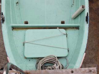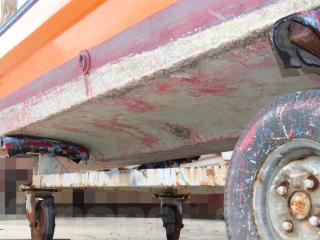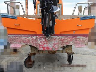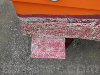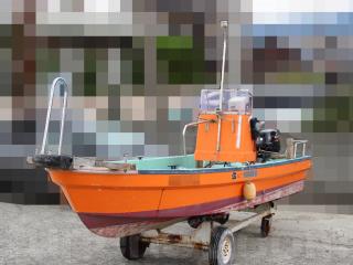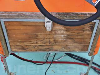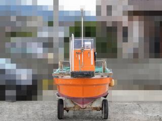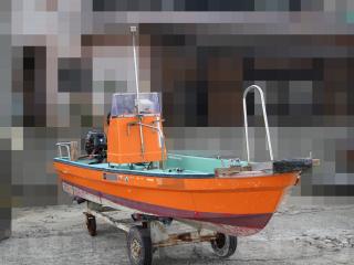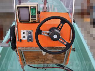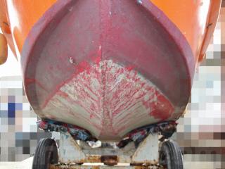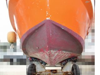 ◆昭和に進水した艇ですが、船外機は平成25年製造のスズキ4サイクル船外機を搭載し、操舵はワイヤー式のヘルムハンドル化されています。船体はオレンジに塗装されて本来の船体色は不明ですが、航行に影響があるような大きな損傷などは無いように見受けられました。また、現在は陸上に揚げて保管されていますので、取材時には船底の写真も撮影させていただきましたが、こちらも航行に影響があるような大きな損傷などは無い様に見受けられました。なお、現在も陸上保管されていますので、船底の様子も確認可能です。