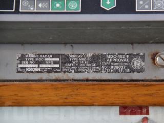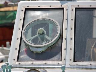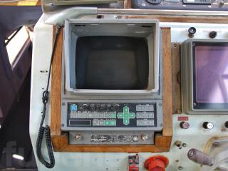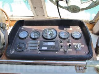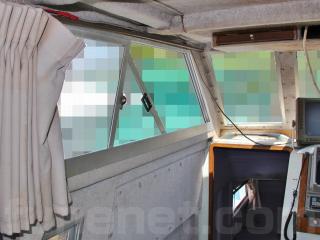 ◆操船席にはアフトデッキからアルミのドアを開けて入れる構造です。操船席の床面はデッキより一段高い位置にあるので、目線の位置も高く前方と左右の見切りは良好です。また、操船席廻りには機器は古いものの扶桑製GPS魚探、日本無線製レーダー、ユニカス製のオートパイロット、三連リモコンなどが装備されています。