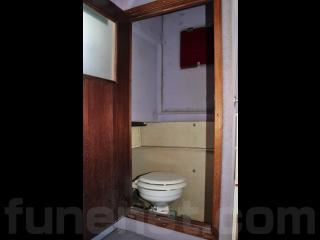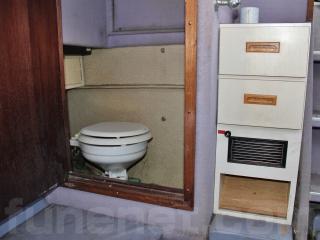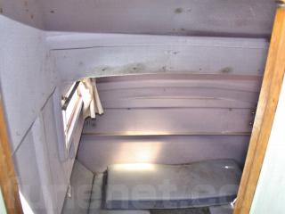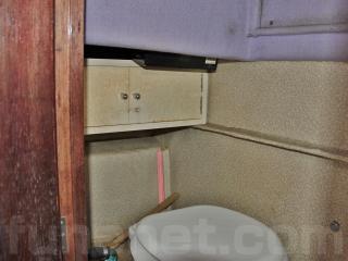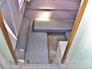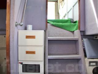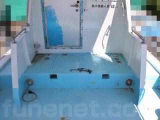 ◆操船席の後ろにも広いスペースがあり、また、操船席の左舷側から階下に降りる階段があり、そこにも船室があります。上下階2フロア併せますとそれなりの人数で雨風をしのげる広さがありますし、階下の船室には個室トイレも付いていますので、居住性を生かした趣味の釣り、遊漁船や作業・運搬船・通船のベースとしても使えそうです。