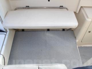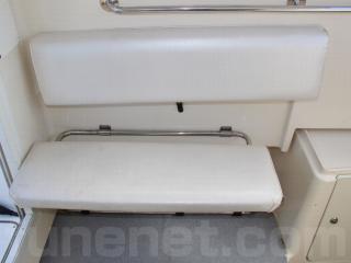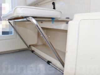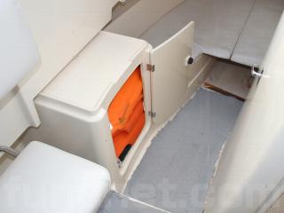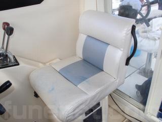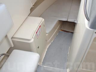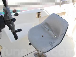 ◆キャプテンシートの生地も良好です。また、この艇はリアドア付きで、コクピット左脇に後方には可倒式のベンチシートも備わっており、冬季や悪天候の際にも大人2人が座って潮をかぶる事無く快適に航行が可能です。