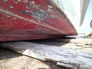 〇船底には致命的な損傷はなく、陸揚げできるように、船底にすべり材が取り付けられています。