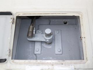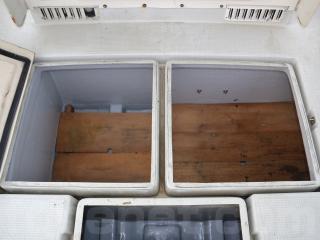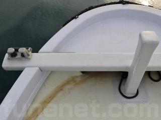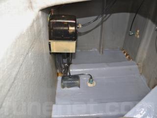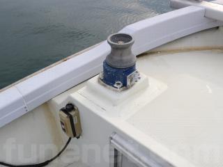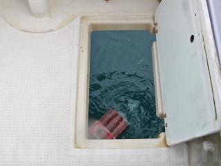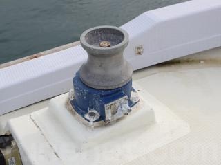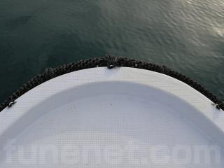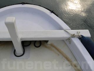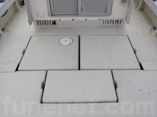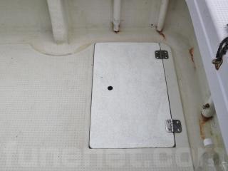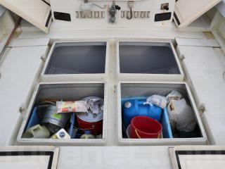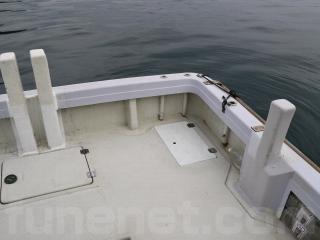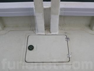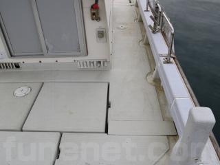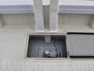 ◆バウにはFRPで巻かれたカンザシが艤装され、耐久性が高そうです。また、カンザシの下には広いスペースのストレージがあり、法定備品の全てをここに入れても余るほどのスペースがあります。また、フロントデッキ(オモテ)には電動アンカーウィンチも艤装されています。また、ブリッジ前にイケスが2間あり、その前2間はストレージになっています。なお、ブリッジの前には吐水口があり、ポンプはエンジン駆動されています。ここにホースをつなげれば海水を汲み上げてデッキをあらったり、イケスに海水を入れたりすることが可能です。