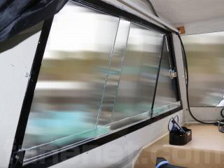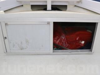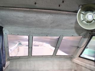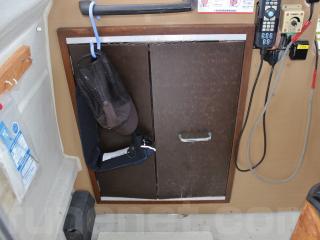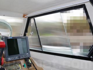 ◆フロントガラスは回転窓仕様です。また、両側スライドガラス窓で夏場も風通しが良さそうです。なお、ヘルムハンドル左のドアを開けるとエンジンが写っていますが、本来はエンジンの上にボードをはめ込む仕様ですので、その上に大人二人が横になれる程度のスペースがあります。(通常ヘルムハンドル左のドアを開けてもエンジンは見えません。取材の時にオーナー様が前もって取り外して下さいました。)またキャプテンシート下の左床にはエンジンルームに通ずる点検口がありますので、そこからもエンジンルームには入れます。