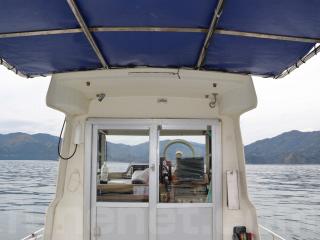 ◆現状の仕様としては、GPS魚探、オーニング、電動アンカーウィンチ、遠隔リモコンなどが艤装され、アフトデッキ(トモ)でも操船可能な2ステーション仕様です。また、マリンギヤは新潟コンバーター製の微速装置付きです。