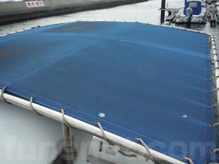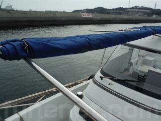 前部のオーニングは中央に巻き取りできますので、航行時や不要時は巻き取って収納できます。