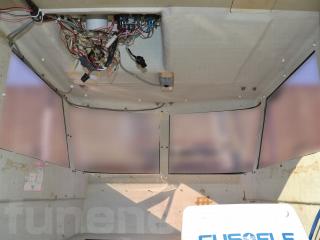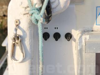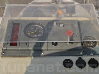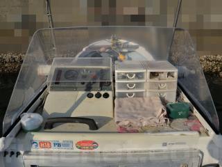 ◆ヘルムハンドル下にはリモコンレバーがあります。また、微速装置を動かすレバーもここにあります。また、ブリッジ上にはヤンマー純正のインパネ(タコメーター、燃料計、アワーメーター等)の下には電圧計、シガライターソケット、USBポートなども付いています。なお、保管時はこれらの計器類ににカバーをかけられています。