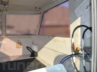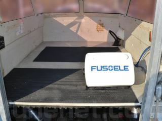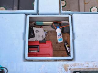 ◆ブリッジのサッシを開けると、エンジン上のボードが現れ、ちょっとした物置になります。サッシを開けて右舷側には、扶桑製の8インチカラー液晶GPS魚探FE-8(全国地図仕様)が備わっています。また、左舷側にはソーラーチャージコントローラー、メインスイッチなどがあります。