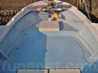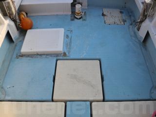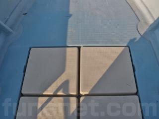 ◆デッキは大きくブアついたり、ノンスリップが異常に摩耗したところなども無く大きな問題は無いように見受けられました。また、サブタも特に補修が必要な割れや表面の痛みなども見受けられませんでした。なお、オモテとトモのブルワークはFRP加工によりかさ上げされていますので、風や潮の被りに対しては強くなっています。また、ブリッジ横両舷にはレールが付いています。