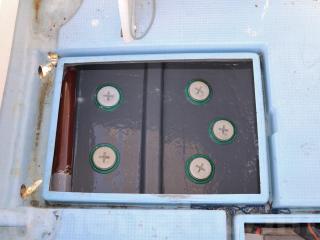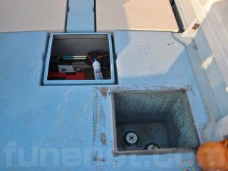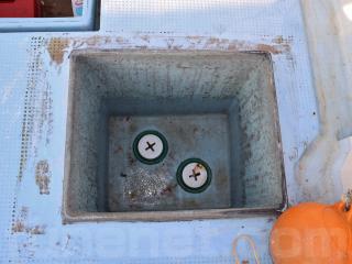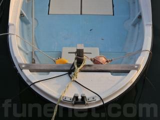 ◆バウ(船首)のカンザシもしっかりしていました。フロントデッキ(オモテ)にはアンカーロープストレージがあり、またブリッジ前にはストレージ2間とイケス2間が備わっています。また、アフトデッキ(トモ)にはストレージ1間とイケス3間も備わっています。イケスは合計5間あります。なお、魚探の振動子はオモテの右舷側イケス内にFRPで貼り込んで設置されています。