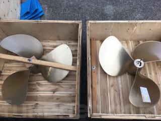◆プロペラは写真の通り、1翼づつ木箱に入っています。木箱の寸法は縦約95㎝×横95㎝×高さ約51㎝です。重量は正確には不明ですが、木箱に入った状態で1翼あたり50~60kgだと思われます。なお、プロペラ単体ですと一人でなんとか持ち上げられた(オーナー様談)との事ですが、木箱ごと運ぶのには2名必要だと思われます。
