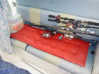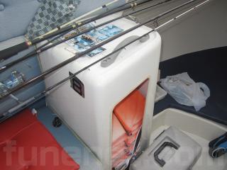 アフトデッキは2~3名で釣り出来るスペースがあり、トランサムのエンジンボックスの上にスポンジは張られているのでイスとして使用できますので、使い勝手が良好なデッキです。