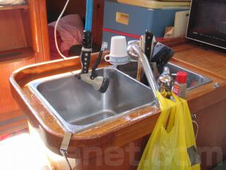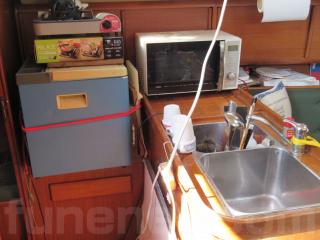 トイレは手動式が装備され、ギャレーにはシンクや電子レンジなどと小物入れが備え付けられています。