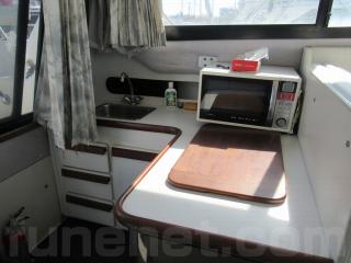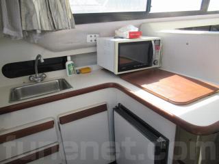 キャビン入口を入るとまず左舷側にギャレーがあります。ギャレーにはシンク、電子レンジ、冷蔵庫などがあります。