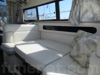 メインキャビンの右舷側には大きなソファー、左舷側にはテーブルとソファーが装備されていてとても広い空間が確保されています。また。右舷側にはトイレも装備されています。