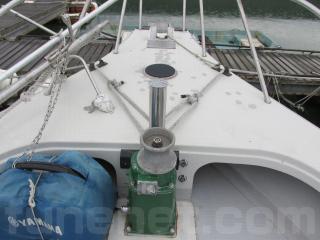 バウスプリットのアンカーウィンチ周りにFRPのカケを補修しペイントしたあとが点在してます。