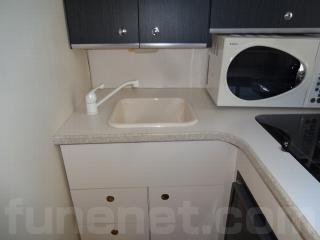 ロアステーションがないため右舷側にはギャレーが設置されています。コンロ・電子レンジ・冷蔵庫とちょっとした調理ならできそうです。