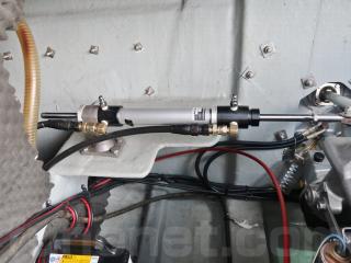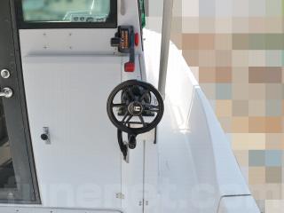 ◆アフトデッキにはセカンドステーションが装備されており、ここでも操船可能です。このアフトステーションのヘルムハンドルはトイレのドアを加工されて低い位置に取り付けられており、操作性が良さそうでした。