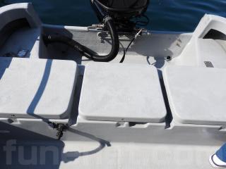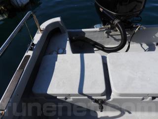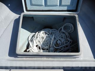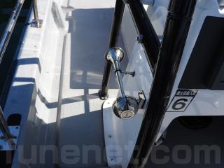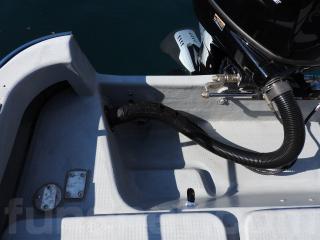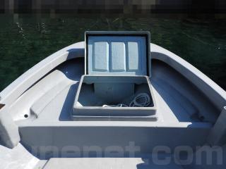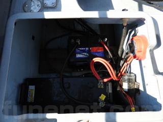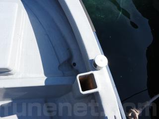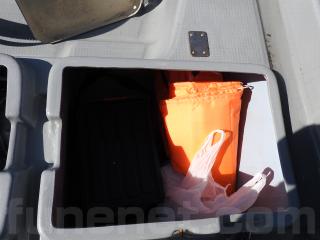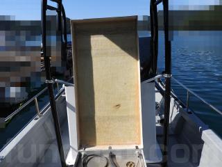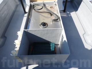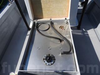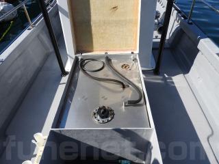 ◆コンソールの前に容量200Lのステンレス燃料タンクを埋め込み据付されています、これにより船体の重心が安定し乗りやすいようです、タンクの収納ハッチを開けると前部分に物入れがあります。