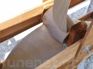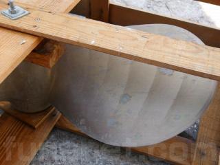 ◆取材時は木枠に梱包されたまま撮影致しました。三枚翼で適合シャフト径はΦ85mmです。なお、刻印によりますと、ダイヤ(D)は960mm、ピッチ(P)は1000mmのようです。