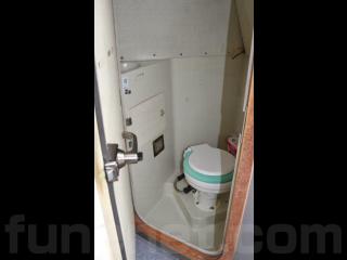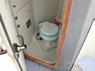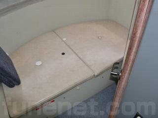 ◆コクピット左舷側から階段を降りると前部にはカディ(小部屋)があり、大人数人が入れます。この部屋は窓が大きく非常に明るいです。ここのシート下には100リッターの清水タンクなどが収まっていますが、空きスペースが収納として使え、便利そうです。また、このカディには個室トイレも備わっています。