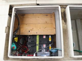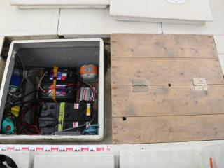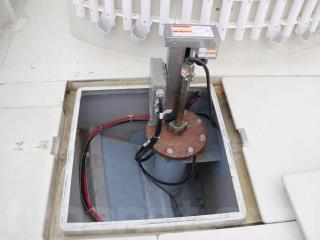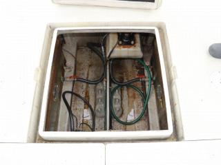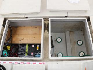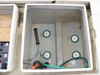 ◆写真No,63のようにアフトデッキ左舷側のイケスでは、イワシなどの生餌をここで生かせるように空気ポンプが備わっており、このポンプを動かすのに専用回路(専用バッテリー)があり、一晩程度ならバッテリー駆動で空気を送り続けられるようになっているようです。また、イケスは生餌を取り出しやすいように分割式の木製蓋も作られています。