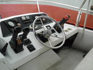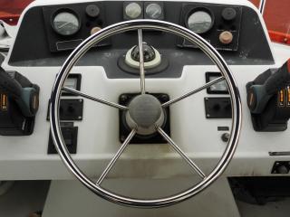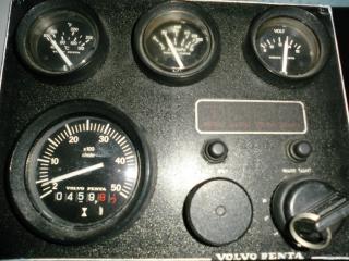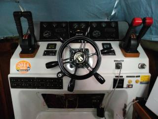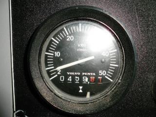 エンジンはボルボペンタ200馬力(型式:AD41P/DP)ドライブ2基がけです。燃料は軽油使用で、タンク容量は400ℓ、最高速度は約28ノットです。アワーメーターは取材時、2基とも459時間でした。