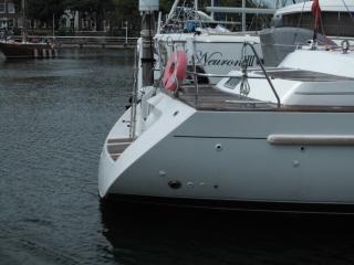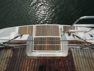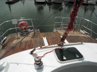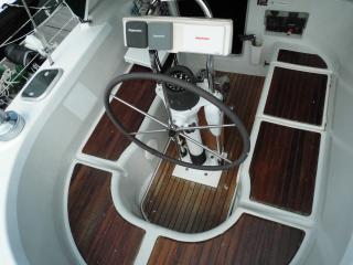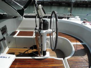 【後部デッキ】デッキもゆったりとしたスペースです。舵はラット式となっており、風向風速計やオートパイロットなども装備しています。