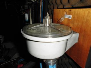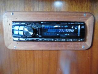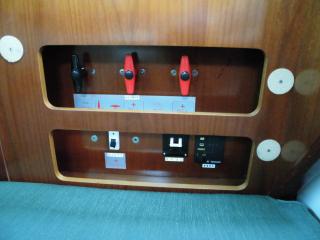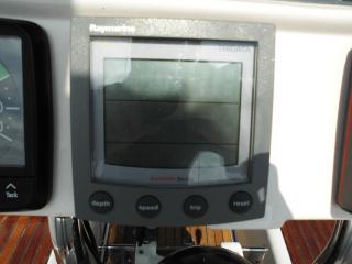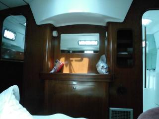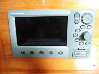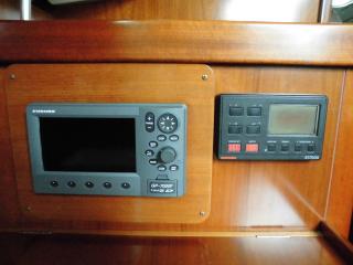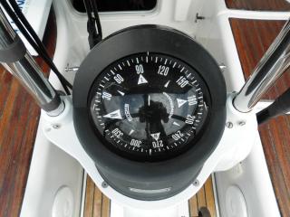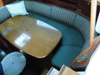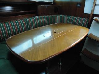 センターキャビンはチーク材と両舷に備えられた布張のコの字のベンチシートで高級感のあるセンターキャビンになっております。その左舷側にはチャートテーブルとシートが設置されチャートテーブルの全面にGPS魚探とオートパイロットが装備されておりました。