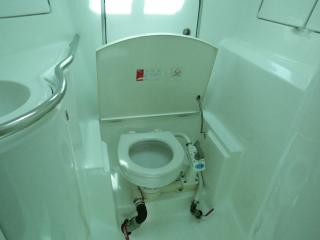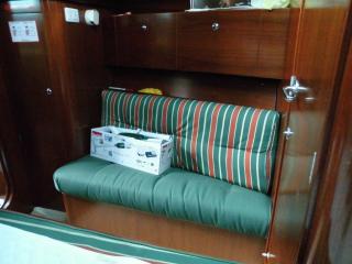 【バウバース】バウバースはクルーズルームとなっており、右舷側にベッドが装備され、左舷にはソファーが装備されていました。その奥にはクルーズ用の手動式のマリントイレが装備され、温水も使えるシャワーが装備されています。