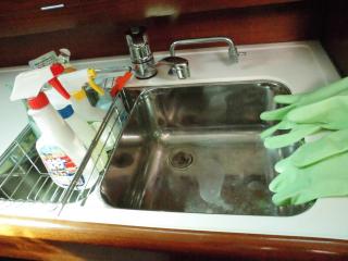 【船内】キャビンは広く、高さも十分にあります。キャビンに入ってすぐ左舷側のアフトキャビンに入る通路にギャレーを装備、冷蔵庫・シンク・ガスコンロ・オーブンを設置しています。