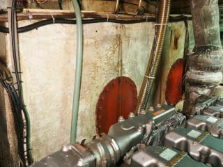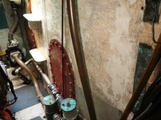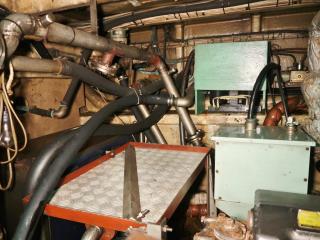 ◆機械場のレイアウトはオモテ側に補機と発電機、補機の後方(トモ側)に主機が据わっています。