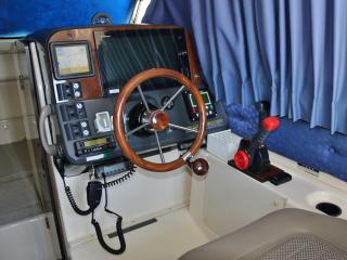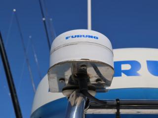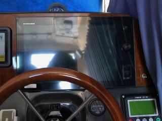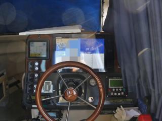 ◆コクピットも綺麗です。インパネ廻りにはトヨタ純正のエンジンモニター、レーダー、サテライトコンパスなどが艤装され、フルノ製14.1型マルチファンクションディスプレイにて鮮明な画像で確認可能です。また、オートパイロット、アマチュア無線も装備されています。なおフルノのGPS魚探が天井に装着されていますが、このGPS魚探はアフトデッキのセカンドステーションにも配線が施されており、そこに移設して観る事も可能です。