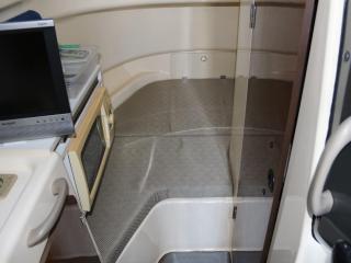◆コクピット左舷側にはエアコンのコントロールスイッチ&吹き出しがあります。エアコンはよく効くとの事でした。またその奥には液晶テレビ&DVDプレイヤー、電子レンジなどが備わっており、コクピットの前が個室トイレになっています。個室トイレの状態も良好でした。