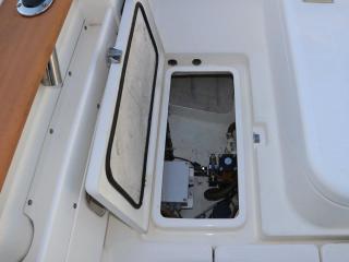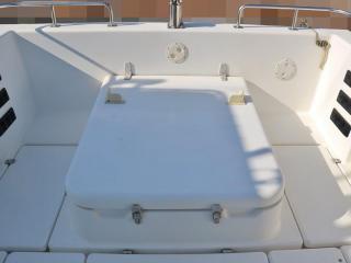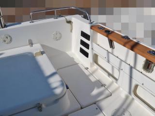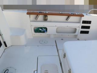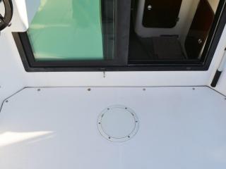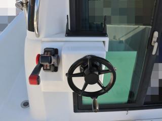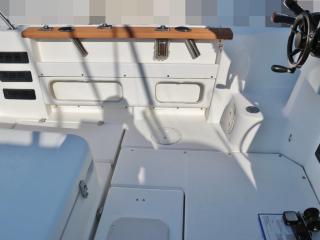 ◆アフトデッキ、リアドア後ろ左舷側にはセカンドステーションが備わっており、コクピットのGPS魚探をここに移設すれば、ここでも快適な操船が可能です。また舵リモコンも備わっていますので右舷側でも操舵可能です。