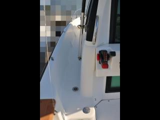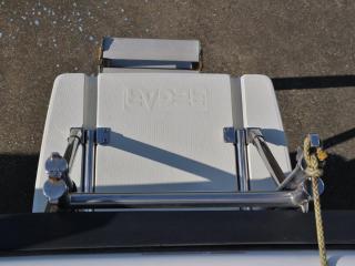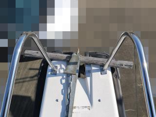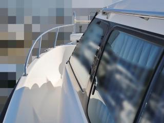 ◆ブリッジ両舷にはアウトリガーも装備しています。また、フロントガラスカバーも付属しています。また、左舷トランサムにはステップとラダーが艤装されていますので、海上へのアクセスも良好です。