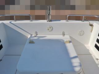 ◆アフトデッキ右舷側にはデッキウォツシュも備わっています。また両舷に埋め込み式のロッドホルダーも備わっています。なお、スパンカーは写真No,29のスパンカー台に装着可能です。スパンカーにつきましては次項の「付属品」にてご確認下さい。