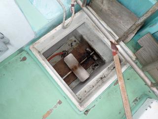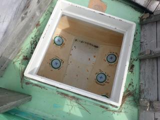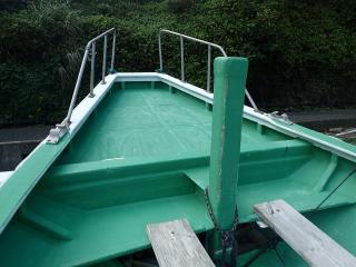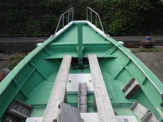 デッキの簀の子を引いたままだと、枯葉やゴミが溜まるため、保管中は、すのこ板を取り外していました。オーナー様の真面目さがうかがえるので、普段より船を大事にされている事を感じました。状態は良好な船となっています。船首のデッキは広々として、釣りや作業にも使い勝手が良いのかと思います。現在の出港回数は多くはございませんが、漁やダイビング船としてご活躍しております。