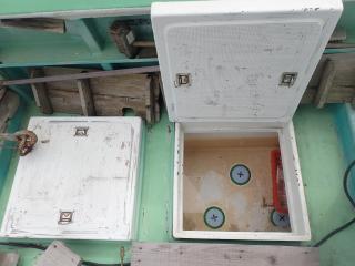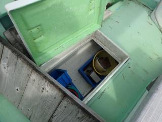 ●バウのデッキは、お客様用の釣り座があり、中央のデッキ床下は、物入と生け簀になっています。