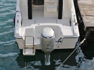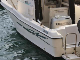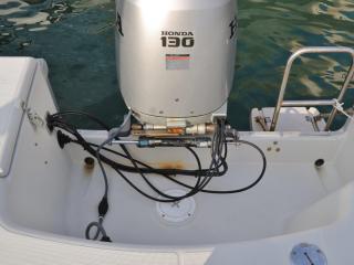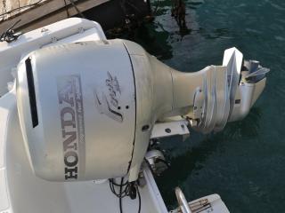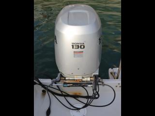 ◆船外機はホンダ製BF130A(型式:BZBE 4サイクル 直列4気筒 130馬力/5500rpm)が載っています。なお、取材時のエンジン・ランタイムは約500時間で、取材時に沖出ししていただいて、最高速を計ったところ、3名乗船で27ノット程度出ました。なお、エンジンを始動した際の音やチルトの動作、航行時の様子などを後項に動画でアップしていますので是非ご覧下さい。