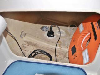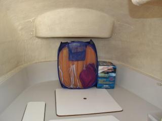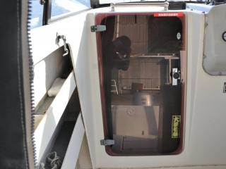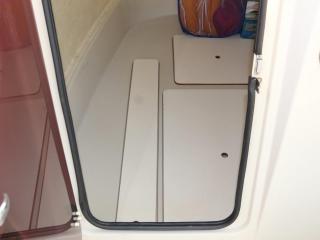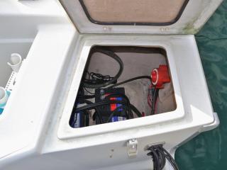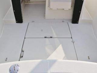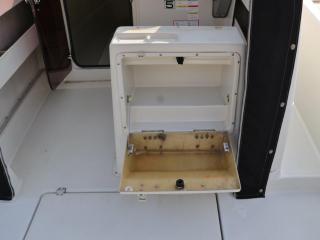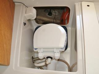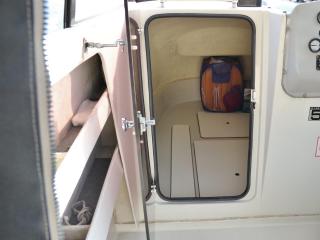 ◆操船席左側にキャビン内に入るハッチがあり、入ると床下に電動マリントイレが装備されています。トイレも綺麗にされています。